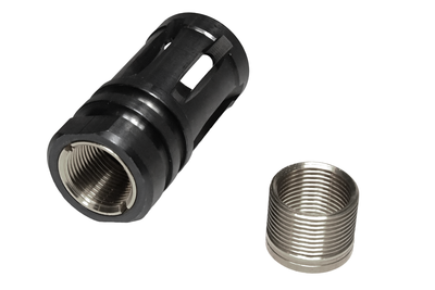 真鍮製の変換アダプターにより、M14正ネジ/逆ネジ両方に適合。幅広い銃種に対応可能。